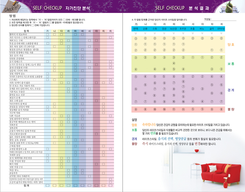근데 한말씀 드리자면.. 표지의 맨 아래...플룻과 악보 이미지... 내지의 쇼파이미지는... 실제 내용과 무슨 연관이 있는지??+_+ 교향곡, 멜로디 -> 이 글과 맞추기 위해서라면... 약간 억지스런감이 있는것도 같구요~ 관련없는 이미지고, 여백 채우기 위해 넣은 이미지라면... 삭제하셔도 무방할텐데요^^ (다른 건강관련 이미지로 교체하시든지)