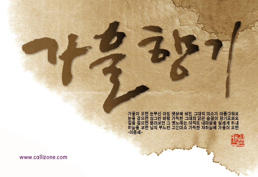 [직접쓴 캘리} 가을향기 callizone 일반 1 9188 2007.10.02 14:07 http://www.callizone.com/home/index.php + 550 가을이 익어가고 있습니다. 가을을 음미하면서 한번 만들어 보았습니다. 회원님들 감기조심 하세요^^